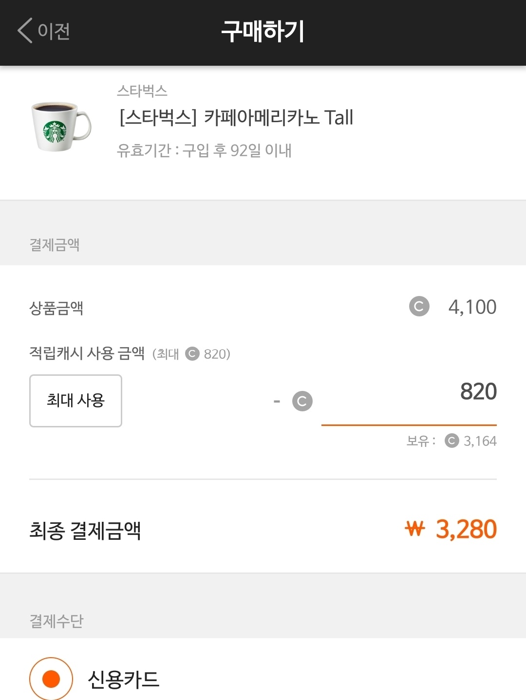 : 스타벅스 아메리카노 한 잔에 5,740캐시.